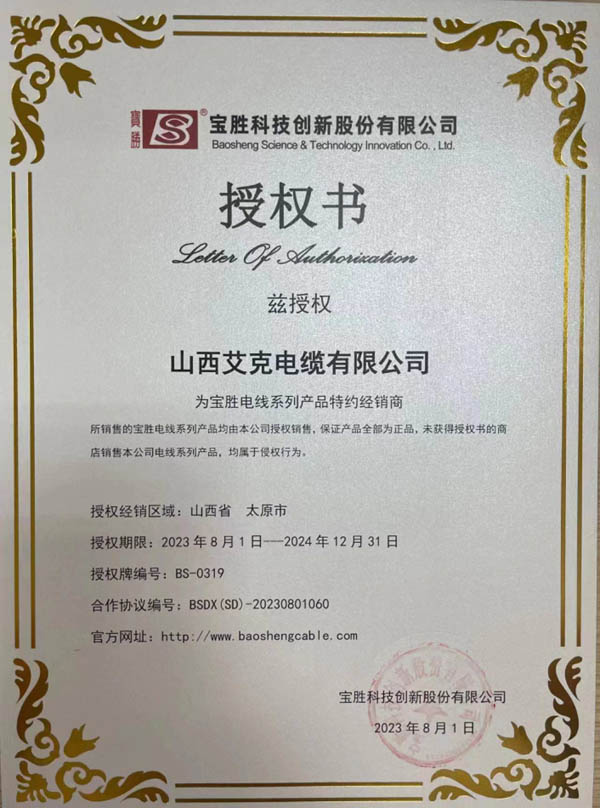 寶勝電纜山西銷售中心山西艾克電纜有限公司是寶勝電線電纜的官方授權(quán)經(jīng)銷商,授權(quán)編號(hào)BS-0319。專業(yè)經(jīng)營(yíng)寶勝牌電線電纜,包括電力電纜,控制電纜,橡套電纜;硅橡膠電纜,氟塑料電纜,補(bǔ)償電纜,各種阻燃,低煙無鹵,耐火,及高溫電線電纜;架空絕緣電纜,船用電纜,礦用電纜,機(jī)車車輛電纜,計(jì)算機(jī)電纜,儀表信號(hào)電纜,高壓交聯(lián)電力電纜,低壓輻照交聯(lián)電力電纜,低壓輻射交聯(lián)控制電纜,低壓輻照交聯(lián)電纜,預(yù)分支電纜,1E級(jí)K3類核電站電纜,承荷電纜,自控溫電纜,布電纜,鋁絞線,和鋼芯鋁絞線等電線電纜產(chǎn)品。產(chǎn)品備有大量現(xiàn)貨、各種型號(hào)顏色齊全、支持配送。